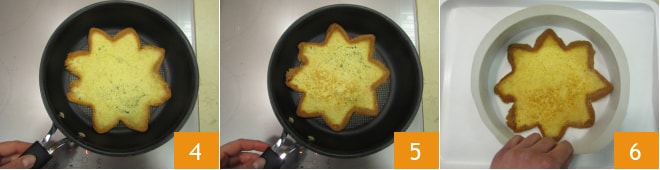 e depois toste-as em uma frigideira antiaderente por alguns instantes 4, até dourar completamente ambos os lados 5. Coloque a primeira fatia tostada no fundo de um prato onde você já terá colocado um anel de confeitaria de 22 cm e forrado com papel manteiga 6.