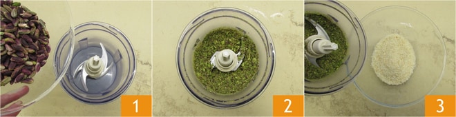 Para preparar a cotoletta de peixe-espada, coloque os pistaches no liquidificador 1 e triture-os até obter um pó 2. Misture o pistache triturado com o panko 3.