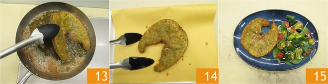 Quando a superfície estiver bem dourada 13, escorra em papel toalha 14 e salgue a gosto. Sirva a cotoletta de peixe-espada bem quente 15 acompanhada de uma salada fresca da estação.