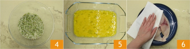 Assim, você obterá o empanado 4. Bata os ovos em uma assadeira 5 e seque o peixe-espada com papel toalha para secá-lo 6.