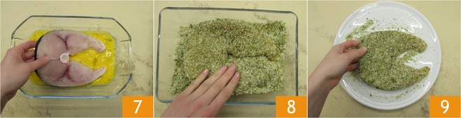 Molhe as fatias de peixe-espada primeiro no ovo batido 7 e depois no empanado 8, cobrindo bem cada parte 9.