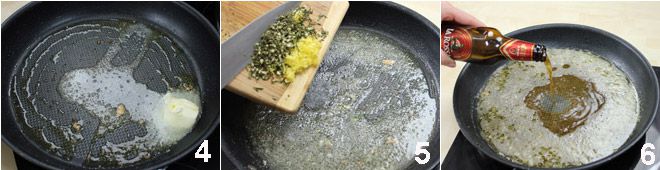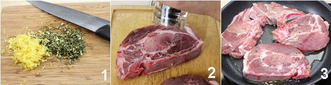 Para preparar as costeletas de porco na cerveja e ervas aromáticas, comece limpando e picando o alho, as ervas aromáticas e a casca de limão 1. Coloque as 4 costeletas em uma tábua e tempere com sal e pimenta 2 de ambos os lados. Aqueça o óleo em uma frigideira e cozinhe a carne por 5-6 minutos de cada lado 3.