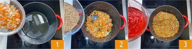 Para preparar o cotechino e lentilhas ao molho, prepare uma mistura de cenouras, aipo e cebolas. Em uma panela, coloque um bom fio de azeite e a mistura 1, refogue em fogo baixo mexendo de vez em quando. Em seguida, adicione as lentilhas depois de lavá-las 2. Misture, deixe pegar sabor por alguns instantes, depois adicione o purê 3.
