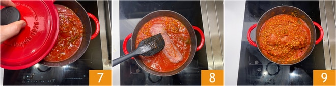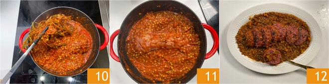 Cubra com a tampa e deixe cozinhar por cerca de 20 minutos. Após o tempo indicado, coloque também o cotechino na panela, removido da tripa 8, mergulhe-o bem nas lentilhas ao molho, com delicadeza 9.