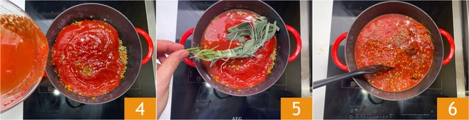 Adicione a água (você pode despejá-la no recipiente do purê para "lavá-lo") 4, então acrescente ao molho o maço de ervas aromáticas (sálvia e alecrim), sal e pimenta a gosto 5. Misture 6.