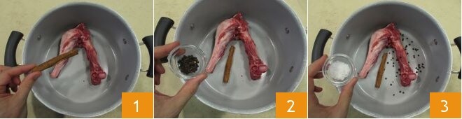 Para preparar o cuscuz à marroquina, comece pela preparação do caldo: após desossar o pernil de cordeiro, coloque o osso em uma panela alta junto com um pau de canela 1 e adicione a pimenta-do-reino em grãos 2 e o sal 3.