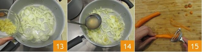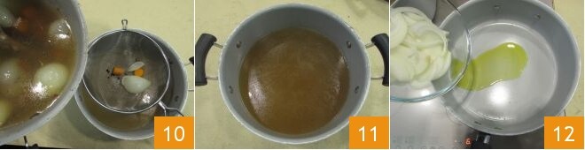Quando o caldo estiver pronto, coe-o com a ajuda de uma peneira 10, recolhendo-o em uma panela que você manterá aquecida 11. Neste ponto, despeje o óleo em uma frigideira grande e acrescente a cebola 12