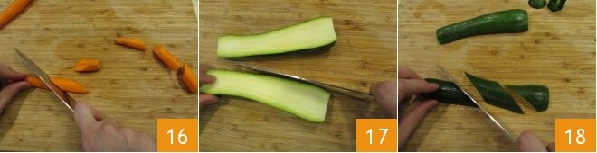 e corte-as em três pedaços fazendo um corte diagonal 16. Faça o mesmo com as abobrinhas, lave-as e retire as pontas: corte-as ao meio no sentido do comprimento 17 e depois em três partes, na diagonal 18.