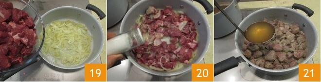 Volte para o refogado e adicione a carne de cordeiro 19, salgue 20 e cubra a carne com o caldo quente 21.