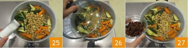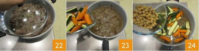 Tampe 22 e deixe cozinhar por 30 minutos. Após esse tempo, adicione as abobrinhas e as cenouras 23 e o grão-de-bico pré-cozido 24.