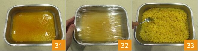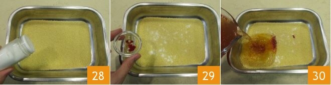 Agora pegue o cuscuz, distribua-o em uma assadeira para criar uma camada fina e adicione o sal 28 e o açafrão 29. Despeje cerca de 200-250 g de caldo quente 30.