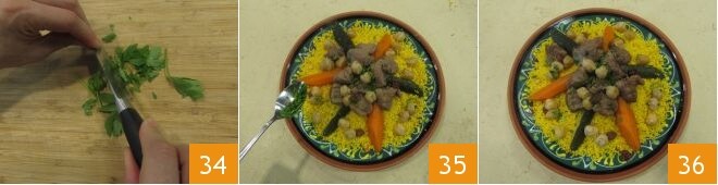 Pique finamente a salsa 34 e passe para a montagem: em um prato grande, coloque o cuscuz e, por cima, disponha os pedaços de cordeiro no centro e os legumes em raio. Polvilhe com a salsa picada 35 e sirva 36: seu cuscuz à marroquina está pronto para ser degustado!