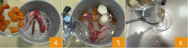 Adicione também as cenouras e a cebola que você já descascou e cortou em pedaços 4 e despeje a água fria 5. Leve para ferver e deixe cozinhar por 40 minutos, removendo a espuma quando necessário com uma escumadeira 6.