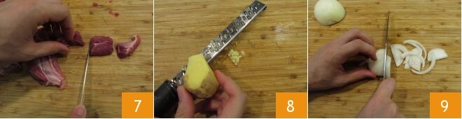 Enquanto isso, corte a carne do pernil de cordeiro em pedaços 7, descasque e rale o gengibre 8 e corte a cebola em tiras 9.