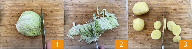 Para preparar couve, batatas e linguiça, comece retirando as primeiras folhas da couve e depois corte-a em tiras 1 2. Descasque as batatas e corte-as em fatias com cerca de 1 cm de espessura 3.