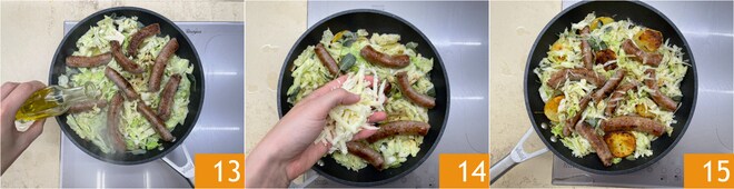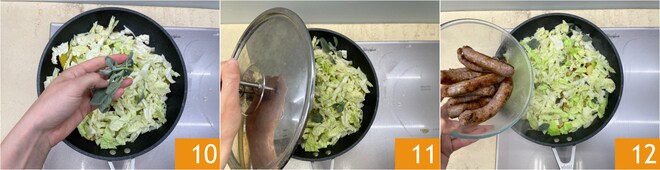 Tempere com folhas de sálvia 10. Cubra com uma tampa 11 e cozinhe em fogo médio por cerca de 10 minutos. Verifique a cocção da couve e das batatas, adicione a linguiça 12.
