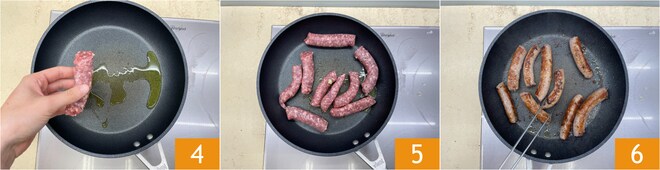 Corte a linguiça em pedaços de cerca de 10 cm de comprimento, depois aqueça um fio de óleo na panela e doure a linguiça 4 em fogo alto até 5 que esteja bem dourada. Neste ponto 6, retire a linguiça e mantenha-a aquecida.