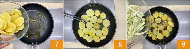 Na mesma panela, adicione as batatas 7 e deixe-as dourar de ambos os lados 8. Salgue e adicione a couve 9.
