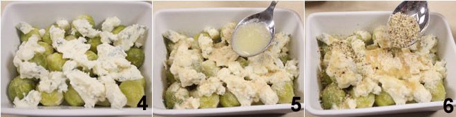 cubra-as com gorgonzola 4 e adicione uma colher de sopa de farinha de rosca. Clarifique a manteiga, aquecendo-a em uma panela e espumando-a até que atinja a transparência do óleo: umedeça a farinha de rosca com uma colher de sopa de manteiga clarificada 5 e polvilhe tudo com nozes picadas 6. Coloque o refratário no forno a 220 graus por 10 minutos e depois ligue o grill por alguns minutos, até que se forme uma crosta dourada na superfície das couves. Retire as couves do forno tomando cuidado para não se queimar, e sirva imediatamente.
