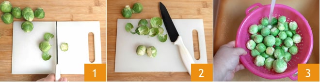 Para preparar as couves-de-bruxelas gratinadas, primeiro limpe as couves removendo o talo com uma faca 1 e retirando eventuais folhas danificadas 2. Enxágue-as sob água fria 3 e seque-as com um pano de prato.