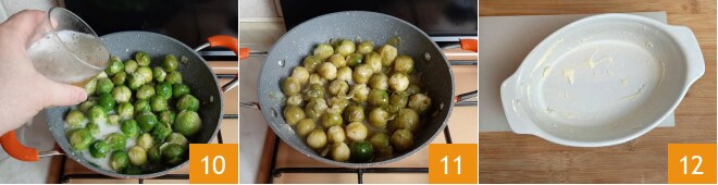 Agora adicione a cerveja clara aos poucos 10, delicadamente, deixando-a evaporar e estufar com as couves em fogo médio-baixo, até que o molho tenha reduzido um pouco, mas não esteja seco 11. Unte uma assadeira 12.