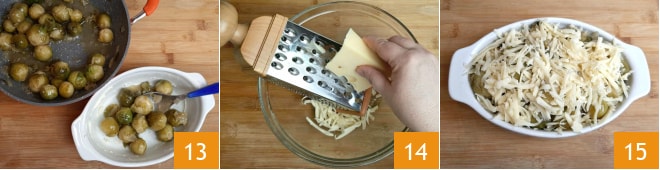 Coloque aqui as couves cozidas 13. Rale o queijo gruyère com o lado de furos grandes 14, cubra com bastante queijo 15 e asse em forno ventilado pré-aquecido a 180° por 8-10 minutos.