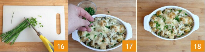 Enquanto isso, corte a cebolinha com uma tesoura de cozinha 16. Quando as couves estiverem bem gratinadas, retire-as do forno, tempere com a cebolinha 17 e sirva quente e derretido 18.