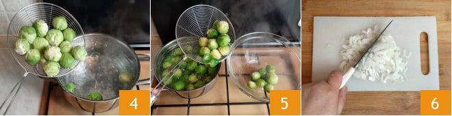 Encha uma panela com água e, quando ferver, coloque as couves para cozinhar 4, sem deixá-las amolecer muito, elas devem ficar "al dente" para continuar o cozimento na frigideira e no forno. Escorra-as 5 e reserve. Limpe a cebola e pique-a com uma faca 6.