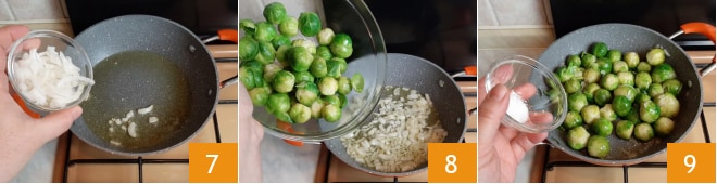 Coloque o óleo em uma frigideira antiaderente, adicione a cebola 7 refogando-a suavemente, quando começar a dourar, adicione as couves 8, ajuste o sal 9 e a pimenta, misture e deixe tomar sabor por 2-3 minutos.