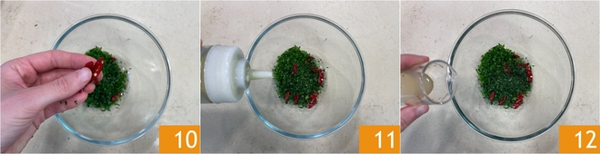 Reúna tudo em uma tigela 10, depois adicione o azeite de oliva extravirgem 11 e o vinagre de maçã 12.