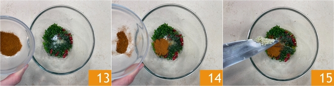 Tempere com uma pitada de sal e especiarias: páprica 13 e pimenta em pó 14. Por fim, adicione o alho picado finamente 15 e misture bem até obter um molho perfumado e brilhante.
