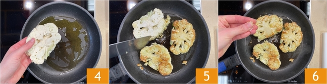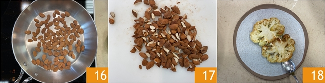 Em outra frigideira, toste as amêndoas por alguns minutos em fogo baixo 16, mexendo sempre para evitar que queimem 16. Quando estiverem bem douradas, pique-as grosseiramente com uma faca 17. Agora você pode montar o prato: disponha 1 ou 2 fatias de couve-flor no prato 18.