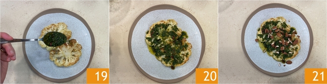 Polvilhe com o molho verde 19 20 e complete com as amêndoas tostadas. A couve-flor assada com amêndoas e molho verde está pronta para ser servida 21!