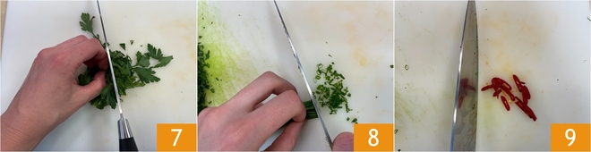 Enquanto isso, prepare o molho verde: pique finamente a salsinha 7 e a cebolinha 8, depois corte a pimenta em fatias finas 9.