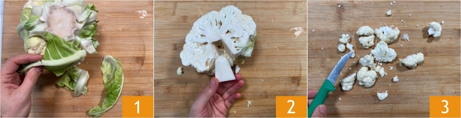 Para preparar a couve-flor na fritadeira elétrica, primeiro limpe a couve-flor: elimine as folhas mais externas 1 e o talo central 2, depois reduza os floretes em pedaços menores 3.