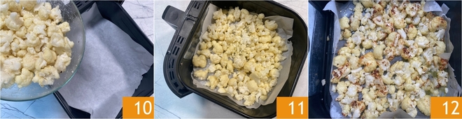 Transfira a couve-flor assim temperada para o cesto da fritadeira elétrica forrado com papel manteiga (nós utilizamos uma fritadeira com capacidade de 6 litros) 10 e cozinhe a 180° por 10 minutos 11. Após o tempo de cozimento, deverão estar bem douradas 12.