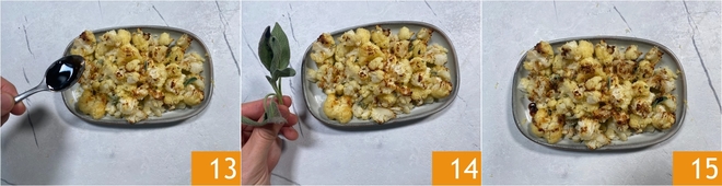 Coloque a couve-flor no prato e finalize com o vinagre balsâmico 13, as raspas de limão e algumas folhinhas de tomilho e sálvia 14. Sua couve-flor na fritadeira elétrica está pronta para ser servida 15!