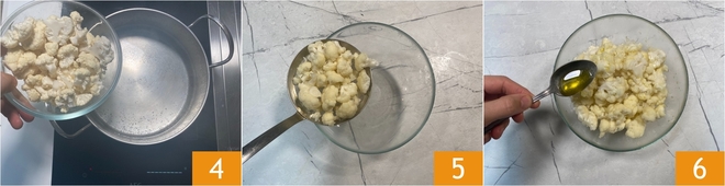 Coloque a couve-flor em água fervente e cozinhe por 5 minutos 4. Escorra a couve-flor em uma tigela 5 e tempere com azeite de oliva extravirgem 6.
