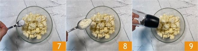 Adicione também o sal 7, o Parmigiano Reggiano ralado 8 e uma pitada de pimenta-do-reino 9.