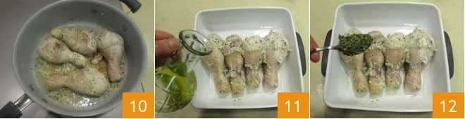Cozinhe o frango em fogo médio por cerca de 10 minutos. Depois de passar o tempo de cozimento na frigideira 10, transfira o frango para uma assadeira, tempere com um fio de azeite de oliva 11 e uma colher de chá de orégano 12. Cozinhe o frango em forno pré-aquecido estático a 220° por cerca de 20 minutos.
