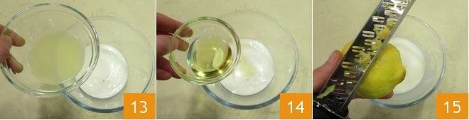 Enquanto o frango cozinha no forno, prepare o molho de acompanhamento: coloque o iogurte em uma tigela, adicione o suco de limão 13, o azeite, uma pitada de sal e perfume com as raspas de limão 15.