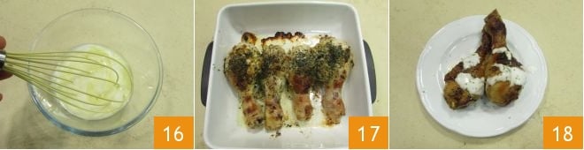 Misture o molho para temperar 16. Enquanto isso, o frango estará pronto, retire do forno 17 e sirva as coxas de frango ao iogurte com o molhinho aromatizado com limão 18.