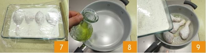 Envolva a tigela com filme plástico 7 e coloque na geladeira para marinar por pelo menos 30 minutos, virando-as pelo menos uma vez. Após o tempo de descanso, aqueça um fio de azeite de oliva em uma panela 8, coloque as coxas e cubra-as com a marinada de iogurte 9.