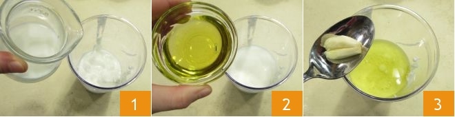 Para preparar as coxas de frango ao iogurte, comece pela preparação da marinada: no copo de um mixer, coloque o iogurte, o leite 1, o azeite de oliva 2 e os dentes de alho descascados 3.