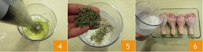 Liquidifique tudo com um mixer de imersão 4 até obter um molho liso, então adicione sal, pimenta e aromatize com o orégano 5, misture tudo para temperar. Agora, coloque uma ao lado da outra as coxas de frango em uma tigela grande, cubra a carne com a marinada à base de iogurte 6, vire-as para umedecer completamente.