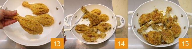 Aqueça uma frigideira no fogo e coloque as coxas de frango 13, regue-as com um fio de azeite e cozinhe em fogo moderado por 20 minutos com a tampa, virando-as na metade do tempo de cozimento 14. As suas coxas de frango crocantes estão prontas, aproveite-as bem quentes 15!