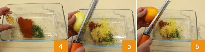 e coloque a mistura em uma tigela grande, adicione a páprica doce, a mostarda amarela em pó 4, a casca do limão 5 e a da laranja 6.