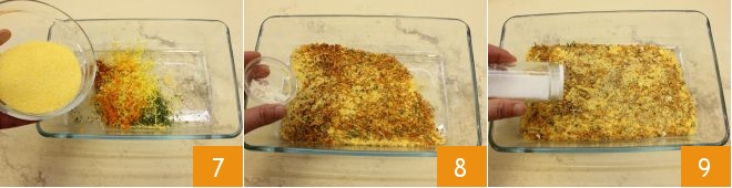Adicione a polenta amarela 7, o alho em pó 8, sal 9, pimenta e misture para integrar a crosta.