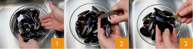 Para preparar os mexilhões à tarantina, cuide primeiro da Como limpar e abrir mexilhões. Enxágue os mexilhões em água corrente 1, depois, usando o dorso de uma faca, remova todas as impurezas externas 2 e arranque a barba com um movimento firme 3.