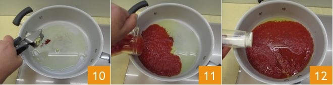 Coloque em outra panela o restante do óleo, adicione a pimenta e o outro dente de alho amassado 10, deixe dourar o refogado em fogo bem baixo, mexendo de vez em quando. Depois adicione a polpa de tomate 11, tempere com uma pitada de pimenta e um pouco de sal (apenas um pouco, pois os mexilhões já são muito saborosos), tomando cuidado para não exagerar, porque os mexilhões já são muito saborosos 12. Deixe o molho cozinhar por 5-6 minutos, mexendo de vez em quando.